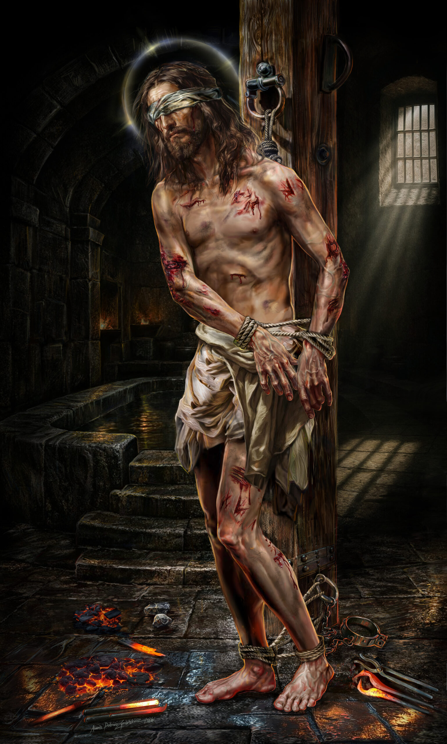 Okrutnie cierpiącego Zbawiciela z powodu zadanych mu ran i przywiązanego do słupa. Gdy znalazł się w lochu, po przesłuchaniu u Kajfasza był już wyczerpany, gdyż w czasie procesu żołnierze ciskali w niego żelaznymi prętami z ostrą kulą na końcu, a na szyję założyli mu łańcuch żelazny z przytwierdzonymi do niego dwoma kolczastymi pierścieniami. Jezus popchany do więzienia był przez strażników poniżony i bity, czego dowodem jest poszarpane ciało przy pomocy metalowych przedmiotów. Strażnicy-sadyści, którzy tam się znajdowali, najpierw ciągnęli Jezusa powiązanego w liny po schodach do lochu i zdzierali z niego szaty oraz kłując żelaznymi szpikulcami, przeklinali Go, naśmiewali się i szturchali. Nie tylko rzucali Nim od ściany do ściany, ale zawiesili Go na belce, aby potem mógł spaść na ziemię, uderzając głową w podłoże. Jezusa popychali, przebijali szpikulcami, pluli. Na twarz – jak widać na obrazie - zarzucili mu płótno, czyli ścierkę zamoczoną w dole kloacznym, która piekła jego skórę na całym ciele. Jego dłonie i nogi były powiązane szorstkimi sznurami, aby nie mógł chodzić i był ciągnięty. Pod stopy rzucili mu natomiast rozżarzone żelazo i drewno. Rzucano w nim też żarzącymi się pochodniami.
